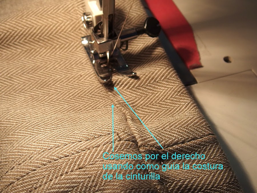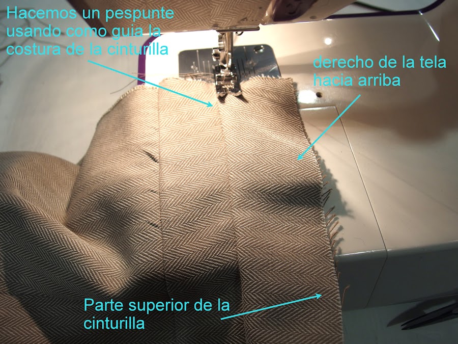 PASO 34: Cosemos por el derecho de la falda usando como guía el encuentro entre la cinturilla y la falda.