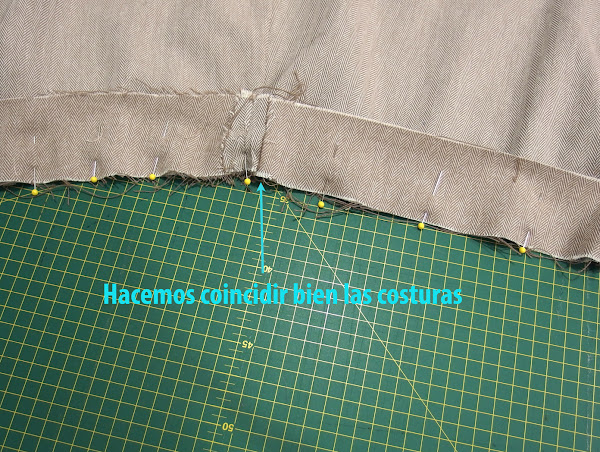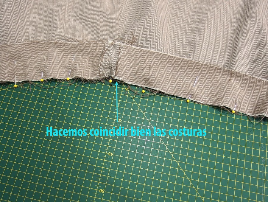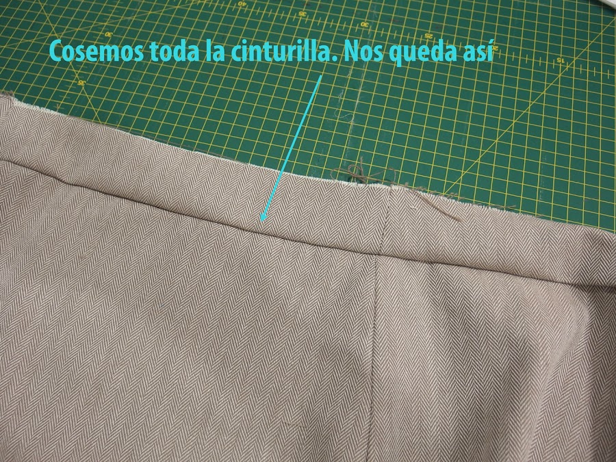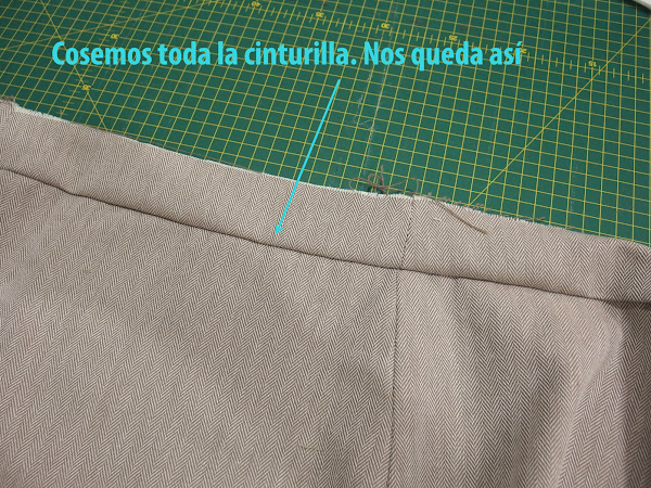 PASO 21: Sujetamos con alfileres la cinturilla a la falda, enfrentando derecho contra derecho, teniendo mucho cuidado de hacer conincider el centro del delentero con el centro de la cinturilla y las costuras entre delantero y partes traseras. Para esto, es mejor colocar los alfileres desde el centro hacia fuera, de manera que si nos sobra algo de la cinturilla nos sobre en el extremo, que siempre lo podemos cortar.