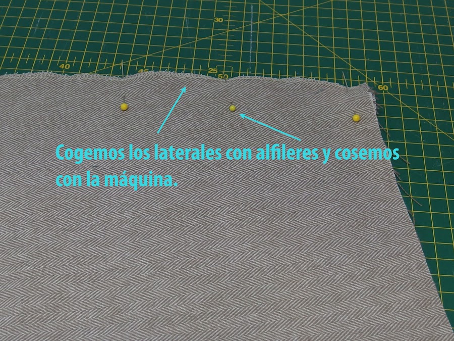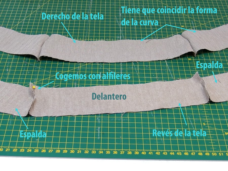 PASO 19: Ahora vamos a preparar la cinturilla. Lo primero es unir los laterales de las cinturillas delantera y traseras. Colocamos la cinturilla delantera en el centrocon la parte cóncava hacia arriba (como está en la foto), y el derecho de la tela hacia abajo (la parte de la tela que vemos tiene que ser el revés). A ambos lados colocamos una de las cinturillas traseras haciendo coincidir la forma de la curva y con el revés de la tela también hacia nosotros. Cogemos las dos costuras con alfileres y repetimos la operación con las tres piezas de cinturilla que nos quedan. Con la máquina cosemos las cuatro costuras,