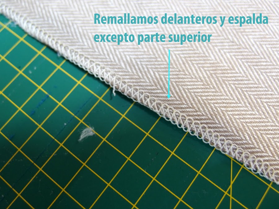 PASO 15: Ahora pasamos a la remalladora. Si no tenemos, sustituimos el remallado por un zig en el borde par evitar que la tela despeluche demasiado. Tenemos que remallar las tres piezas principales de la falda (delantero y partes traseras). Remallamos todo el contorno excepto la parte superior de cada pieza.