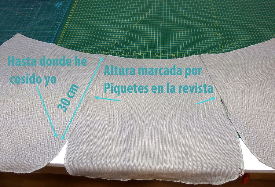 PASO 17: Ahora solo tenemos que coser los laterales que hemos sujetado con alfileres. En teoría hay que coser hasta los piquetes que teníamos marcados (como está en la foto), pero yo he alargado la costura hasta los 30 cm desde la parte de arriba. Vosotras lo podéis hacer como más os guste, pero a mí no me gustaba una abertura tan alta (que una ya no está para enseñas tanta pierna... jeje)