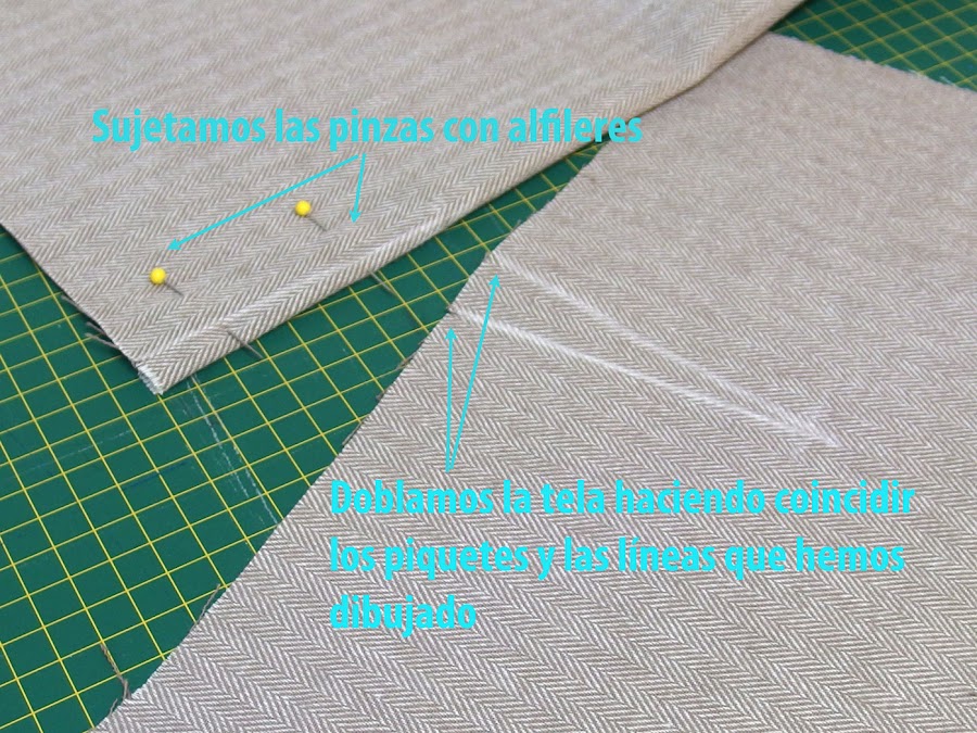 PASO 12: Lo primero que vamos a hacer son las pinzas de la parte trasera de nuestra falda (que las tenemos marcadas del paso 10. Tenemos que doblar la pieza (con el derecho de la tela hacia dentro), desde el centro inferior de la pinza, haciendo coincidir os piquetes que hemos hecho en los dos extremos superiores de la pinza y sujetamos con alfileres. Hacemos lo mismo en la otra pieza trasera de la falda.