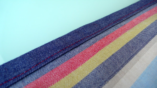 El lado del rectángulo grande que queda sin cubrir lo doblamos pasándolo por encima del pequeño, hilvanamos todo alrededor y cosemos a máquina.