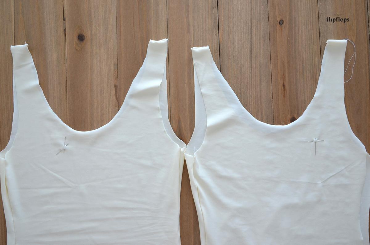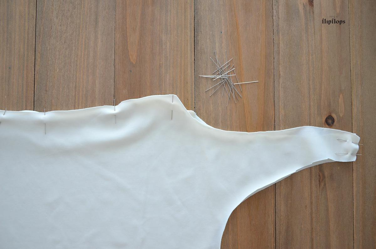 3- Coloca lados buenos enfrentados, ayudándote de alfileres, para coser los laterales y los tirantes del vestido.