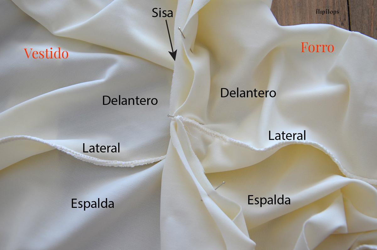 5- Une el vestido al forro. Recuerda que los lados buenos deben ir enfrentados al coser . Para saber como coserlo si te pierdes te dejo un truco: mete el forro dentro del vestido e imagínatelo como debería ir terminado, esto te dará la visión para saber que coser y por donde.Poco a poco siguiendo esta lógica vas cosiendo. Hay que coser las sisas, el escote delantero y espalda. Mira este esquema.