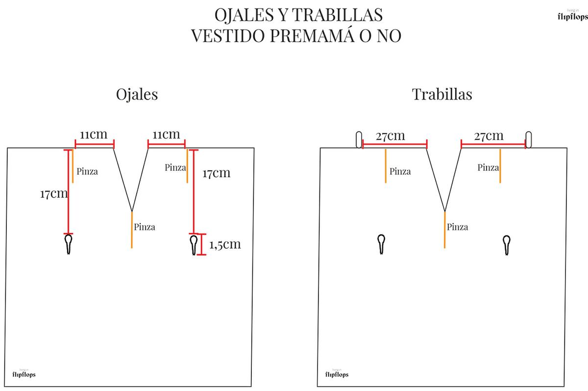 Trabilla= se colocan a 27 cm del centro tanto a la derecha como a la izquierda ¿Aún no dominas los ojales? Hace unas semanas te contaba todos los secretos sobre ellos en este post, no te lo pierdas