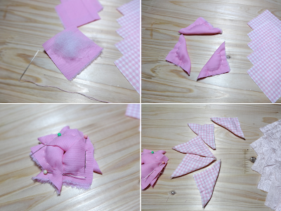 Cada cuadro se rellena solo un poco con guata (probé rellenar demás pero no se obtiene un buen resultado), se requieren alfileres para hilvanar cada pétalo y para acomodarlos entre si