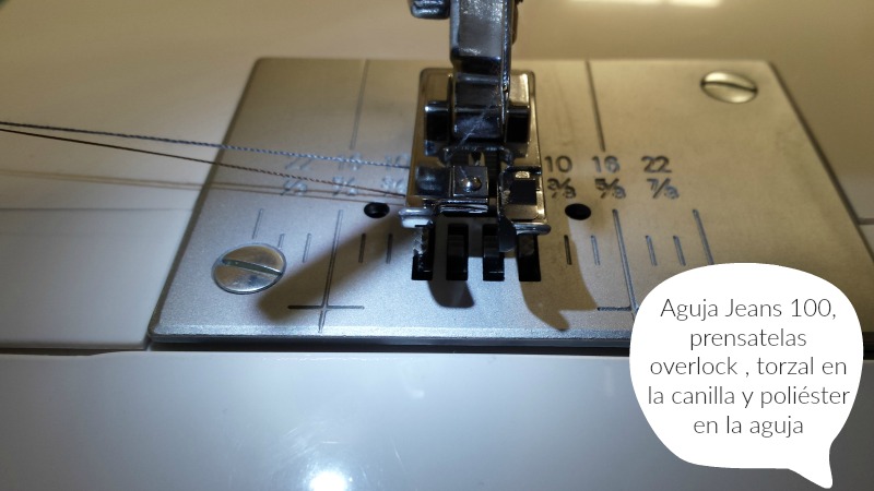 Hilo torzal. Es el hilo que se emplea para coser los remates de los jeans. Fácilmente identificable porque suele ser de color ocre. Es un hilo muchísimo más duro y resistente, ideal para prendas que tendrán un mayor desgaste. ¿Dónde lo colocamos? en la canilla. Debido a que vamos a coser el pantalón del revés y queremos que el torzal quede por el derecho. En el caso contrario, si coses el bajo del pantalón por el derecho, deberás colocar el torzal en el portahilos, pasando por la aguja ¿Capisci?
