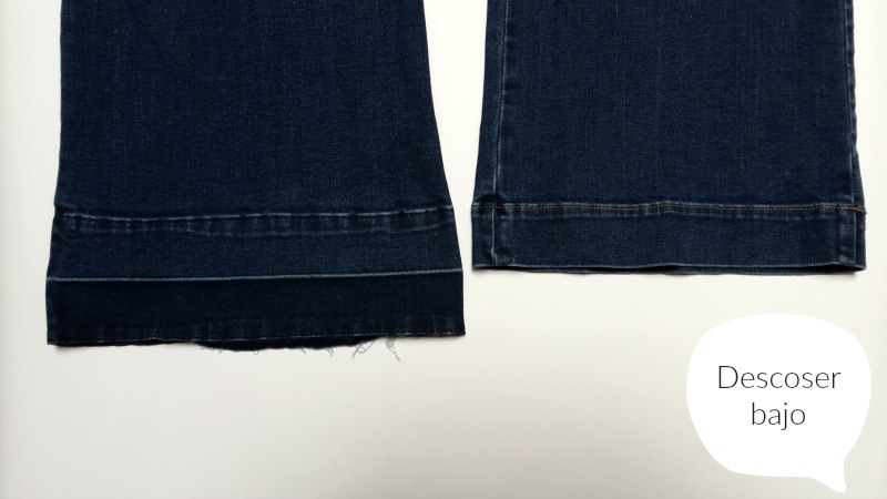 Tenía la imperiosa necesidad de coger el bajo a unos pantalones vaqueros adjudicados a precio de ganga en las últimas rebajas. Como veis en las imágenes, originalmente traían un bajo bastante ancho y era justamente la medida de ese bajo lo que tenía que subir, lo que me sobraba. Para ello no me quedaba otra opción que descoser el bajo original, ya que necesitaría parte de esa tela para hacer el dobladillo. Si por el contrario, tuviera que subir más trozo de pantalón, podría cortar directamente el bajo original y hacer un dobladillo nuevo... ¿Si?