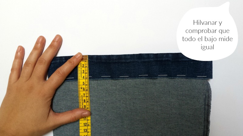 Soy de la vieja escuela y creo que hilvanar es un paso imprescindible. No me gusta coser a máquina con los alfileres puestos, ni planchar por encima de ellos tampoco. Una vez hilvanado el bajo, nos tendremos que asegurar de que todo mide lo mismo.