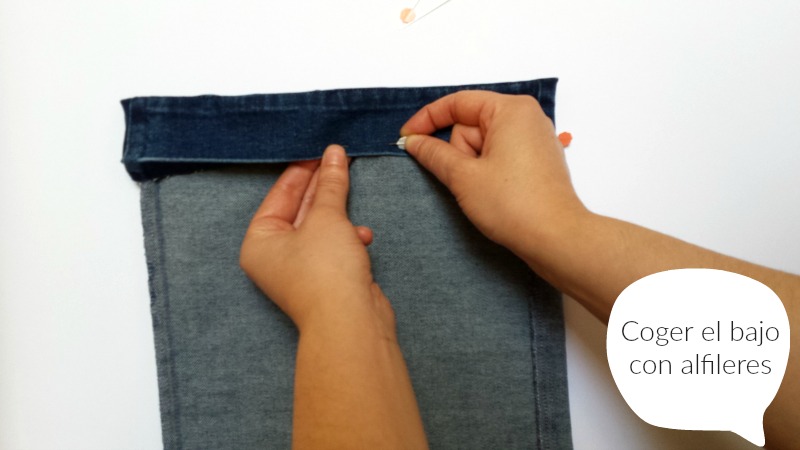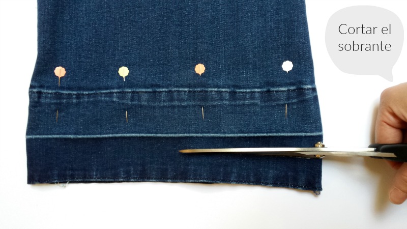 Colocamos nuestro bajo y lo cogemos con alfileres (obviamente por el revés del pantalón), metiendo hacia dentro el centímetro que dejamos en el paso anterior para formar el dobladillo. Yo he optado por dejar la misma medida de bajo que el original, con casi 4.5 cm de ancho.