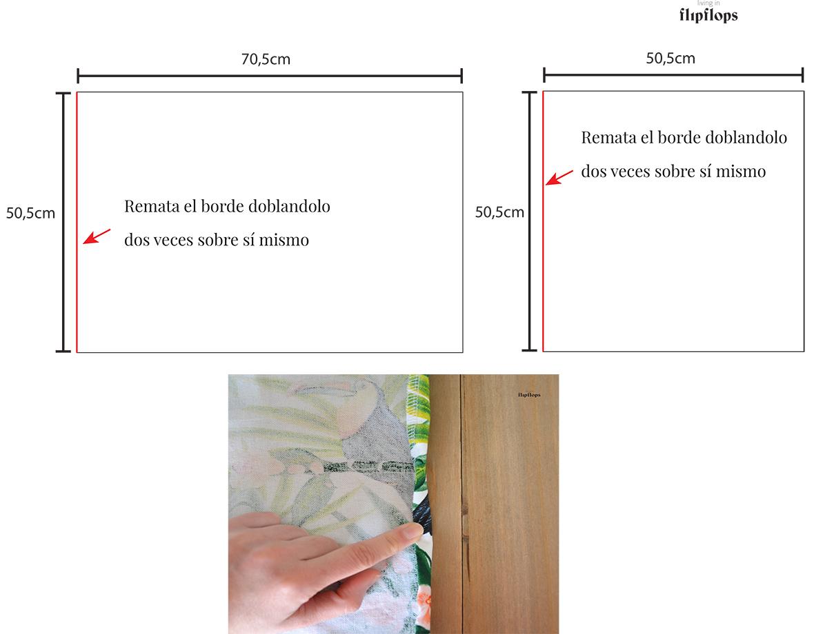 4 – Remata un borde ( el que mide 50,5cm) de cada trozo de tela, doblandolo dos veces sobre si mismo, como hemos hecho en otros tutoriales.