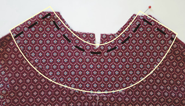 Ahora recortaremos la costura, dejándola a 05cm, haremos pequeños piquetes en las zonas curvas y recortaremos la esquina de la zona donde comienza la abertura de la espalda.