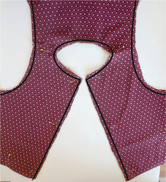 Ahora pasaremos a unir con alfileres y a coser los hombros del chaleco exterior y del forro:
