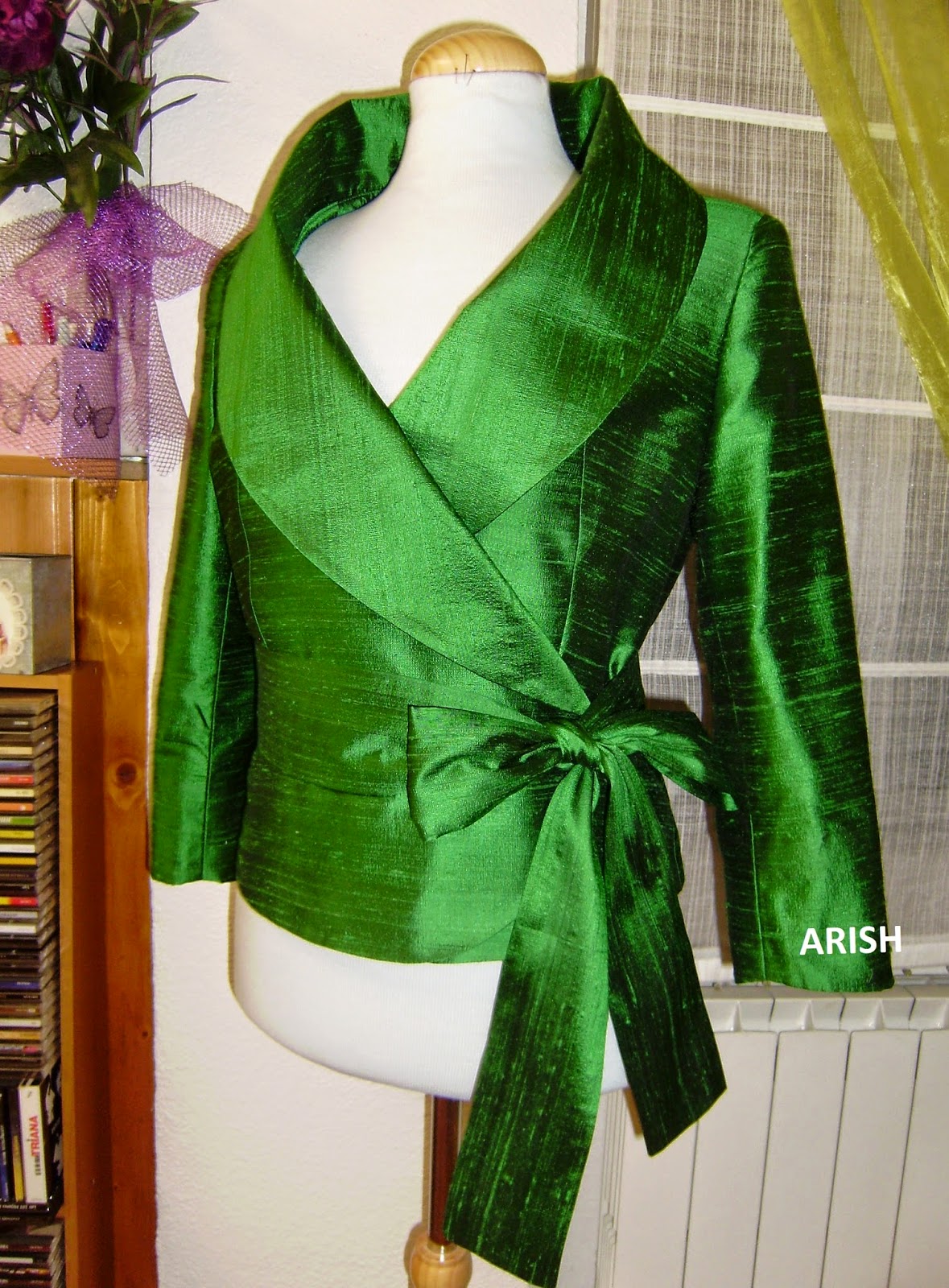 al vestido le puse un cinturón de 4 cms. con una hebilla metálica tipo broche redondo en plateado y adornada de cristales y para la ceremonia religiosa me pareció lo mmás correcto acompañarlo de una chaqueta corta del mismo tejido con manga 3/4, cruzada con cuello esmoquing hueco y con lazada anudada, aunque realmente hacía tanto calor que sobraba todo