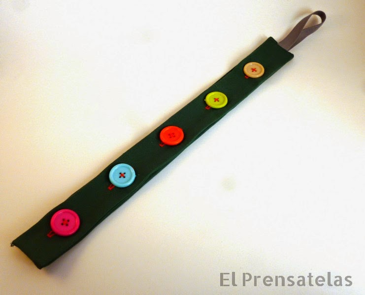 He cosido los ojales algo más grande de lo que debieran para los botones para que resulte fácil abrochar y desabrochar, y le he cosido unos botones de colores, de esos que tienen todos los chinos, espero que le guste y que le sea útil, ya os contaré que tal: