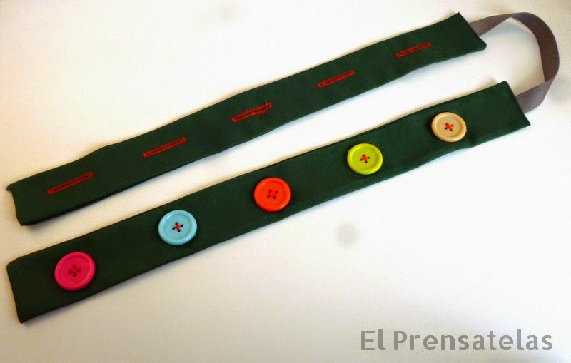Como véis sólo consta de dos tiras de tela, las mías son de 38 cm x 4 cm. acabadas y las he unido con un resto de cinta, que además me servirá para colgarlas: