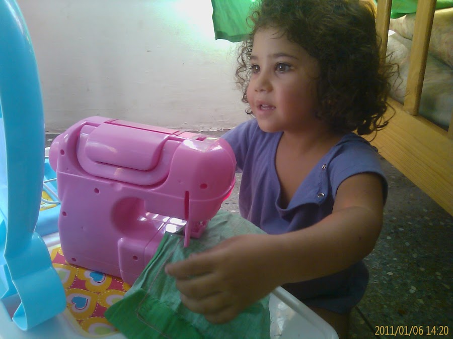 Victoria haciendo manualidades con la maquina de coser, uno de los tantos regalos que le dejo la navidad!!!!!!!