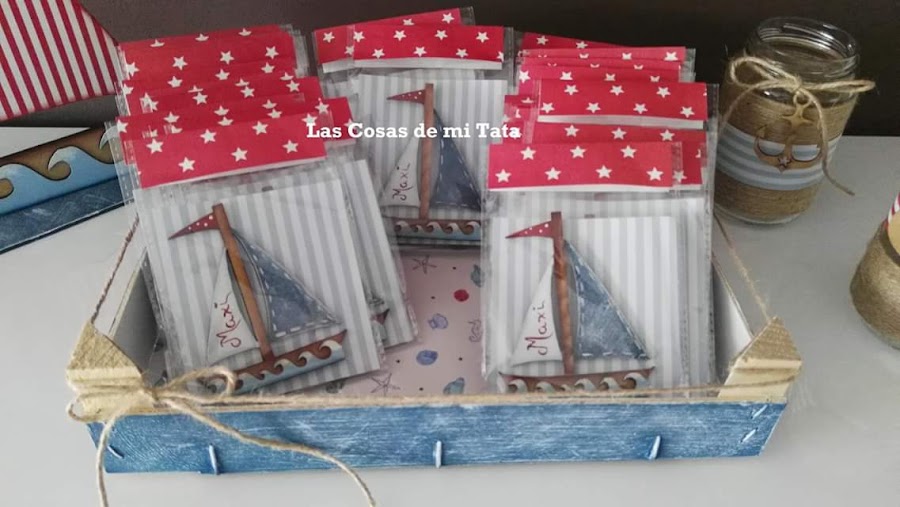 Así de chulis quedaron las cositas del Bautizo de mi peque. Con temática marinera. De regalito dimos unos imanes de madera para la nevera pintados a mano uno a uno y empaquetados individualmente.