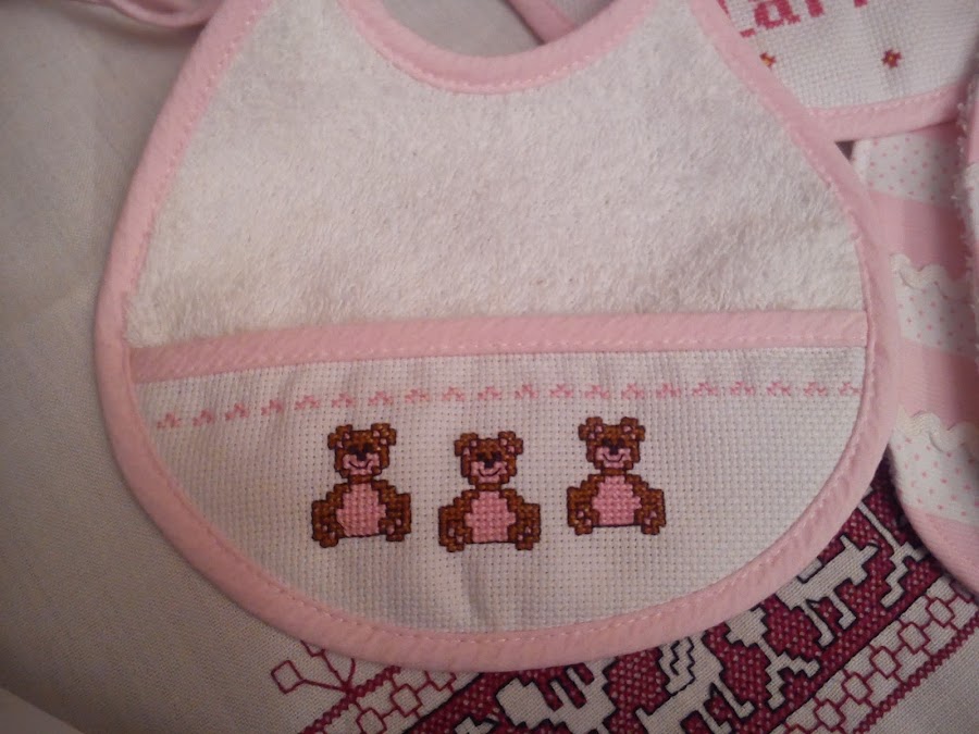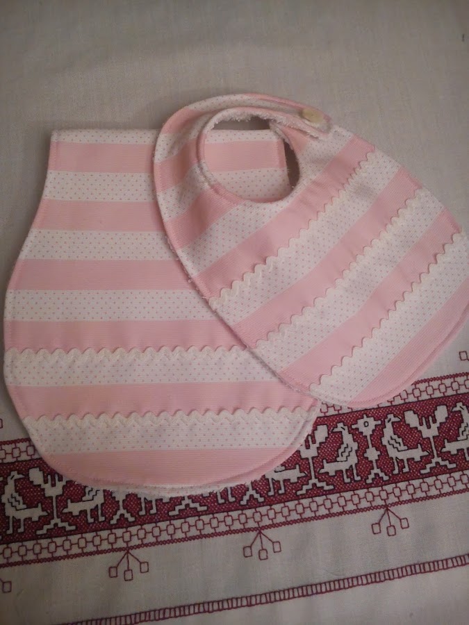 Un arrullo, una toallita para que la mamá se coloque en el hombro cuando la niña acabe de comer y baberos, todo a juego. ¿Qué os parece?