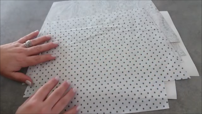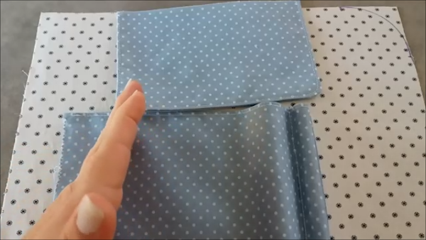 1 pieza en tela exterior, 1 pieza en tela de forro y 1 pieza de entretela (en mi caso termoadhesiva) las tres con unas medidas de 30x22 cm. Con esto haremos la solapa de las brochas.