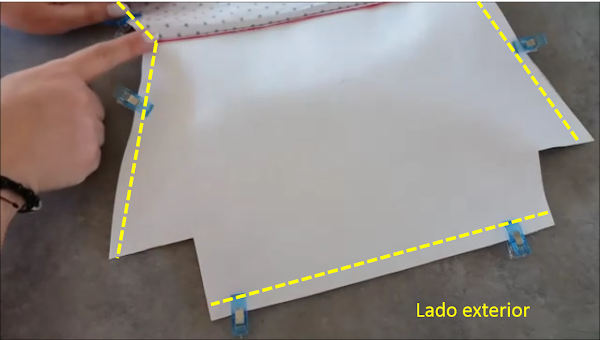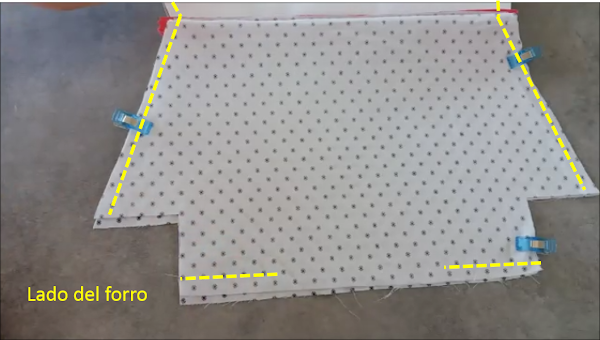 Sujetamos y damos la vuelta para poner ahora la pieza del forro, también con el derecho hacia abajo.