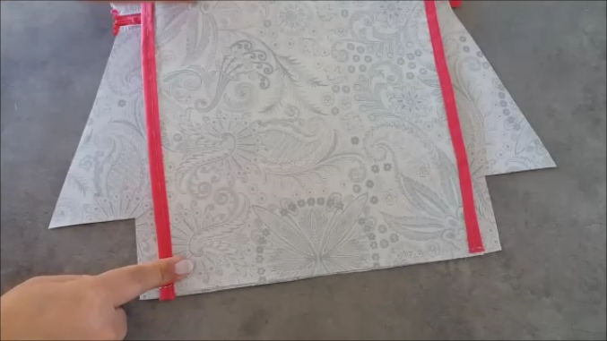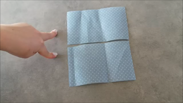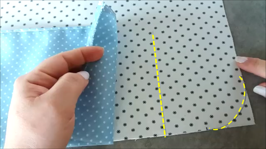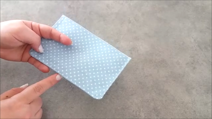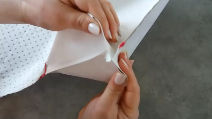 Luego cerramos las esquinas haciendo que coincidan la costura de abajo con la costura lateral y cortamos el sobrante de tela.