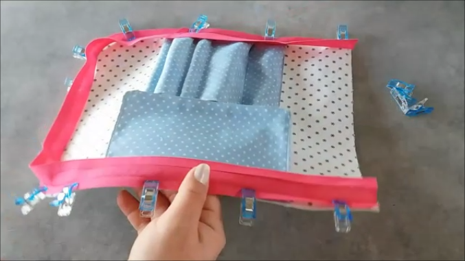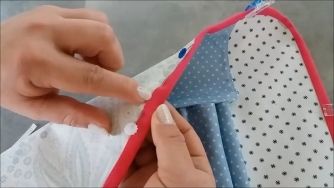 Ahora, le ponemos la solapa porta-brochas a una de las caras de la cosmetiquera. Para esto apartamos los forros y colocamos la solapa con la parte de las brochas hacia abajo, y cosemos por el borde inferior.