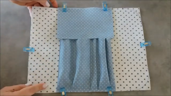Y colocamos la pieza portabrochas (la de 14x22cm)justo por la línea, pero antes debemos hacerle un pequeño doblez por el borde. Y cosemos bien pegadito a la orilla, tal y como te indico en la siguiente imagen: