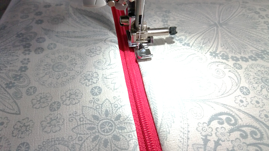 Entonces ponemos la cremallera empezando por una de las piezas de tela exterior, a la que colocamos la cremallera con la parte que abre hacia abajo, y encima una pieza del forro también con el derecho hacia abajo, y cosemos las tres piezas juntas.