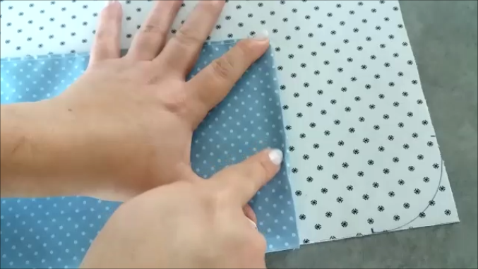 Esto también lo vamos a reservar un momento y pasamos a la pieza del forro de 30x22cm. A ésta pieza (que ya le hemos puesto la entretela) le vamos a redondear dos de sus esquinas y marcaremos una línea a los 8 cm del borde desde donde hemos redondeado, así: