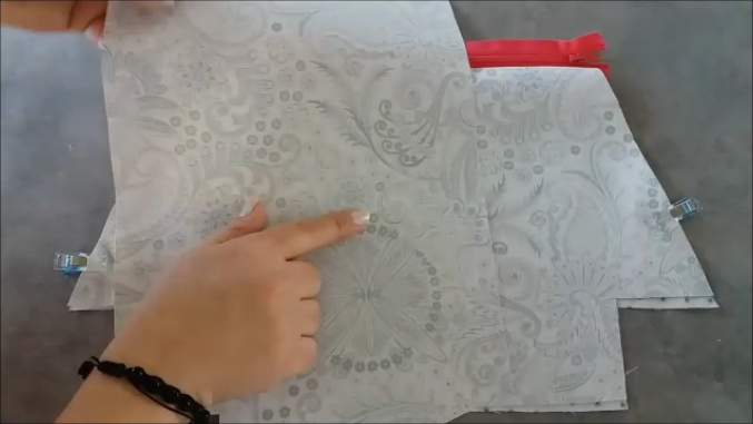 Luego de esto, apartamos un poco la solapa para que no moleste, abrimos la cremallera a la mitad y unimos tela principal por un lado y tela de forro por otro y cosemos de la siguiente manera: