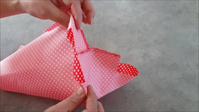 Lo doblamos como hicimos con la pieza exterior y cosemos por el borde, para luego cerrar las esquinas como hicimos antes con la pieza exterior, así: