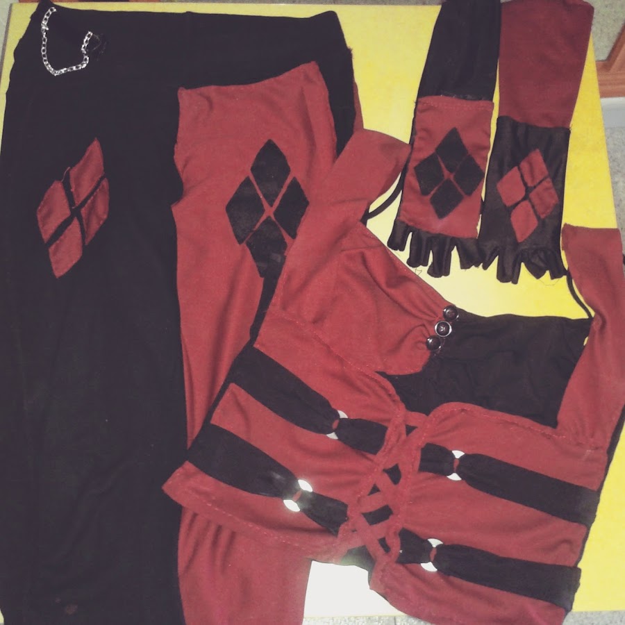 El traje es, en realidad, de cuero, pero yo lo he llevado de la manera más económica posible, por lo que solo he tenido que comprar los leggins, la camiseta y la tela burdeos (por solo 3???), más los complementos y no me he gastado más de 15??? en el traje. La peluca la he comprado a parte, porque ya me sirve para muchos eventos, y es rubia, al que le he tintado las mechas negras y rojas con spray colorante para pelucas.
