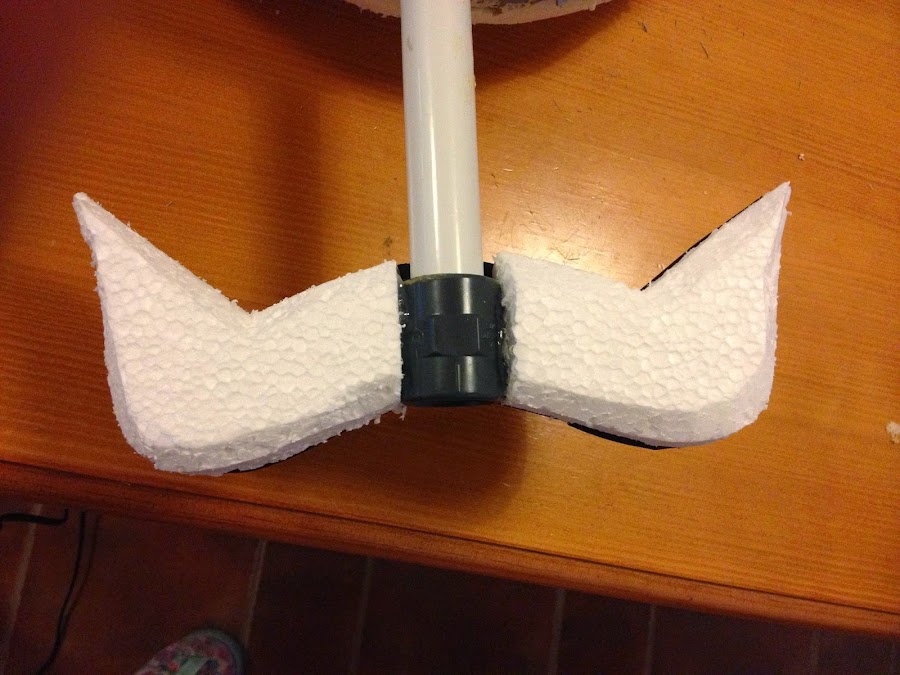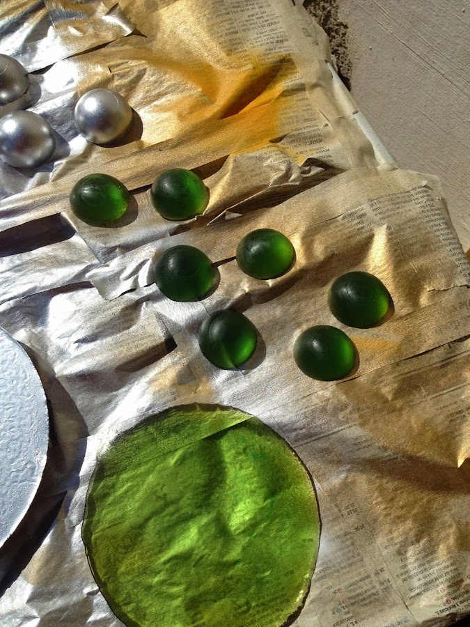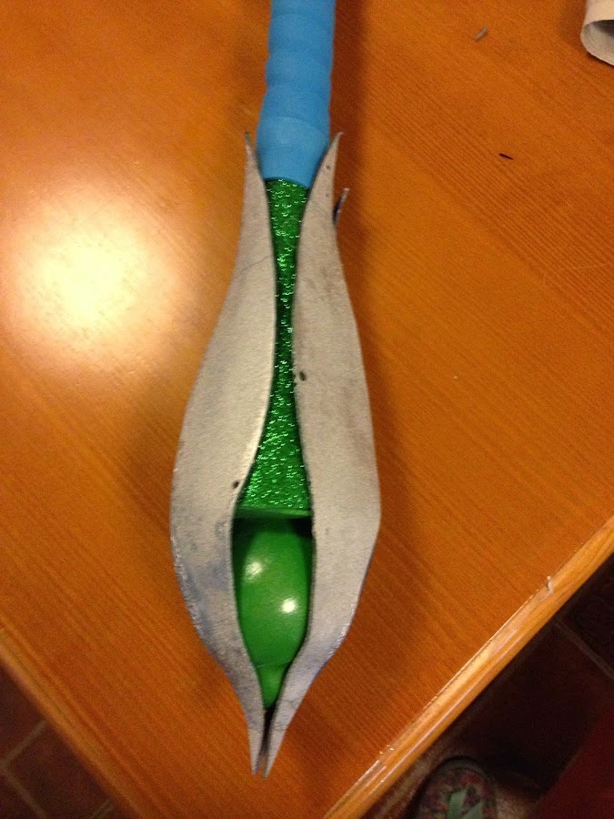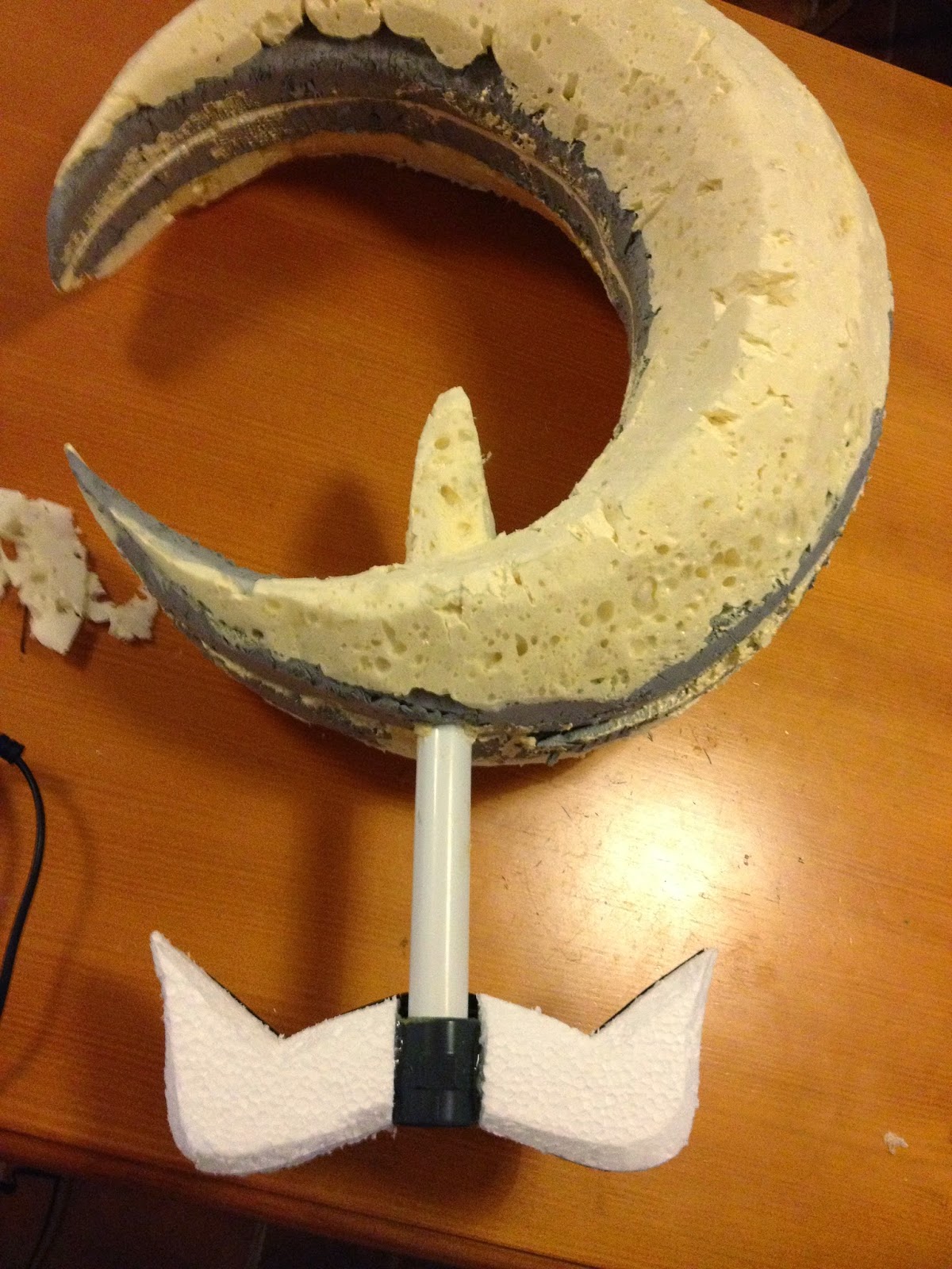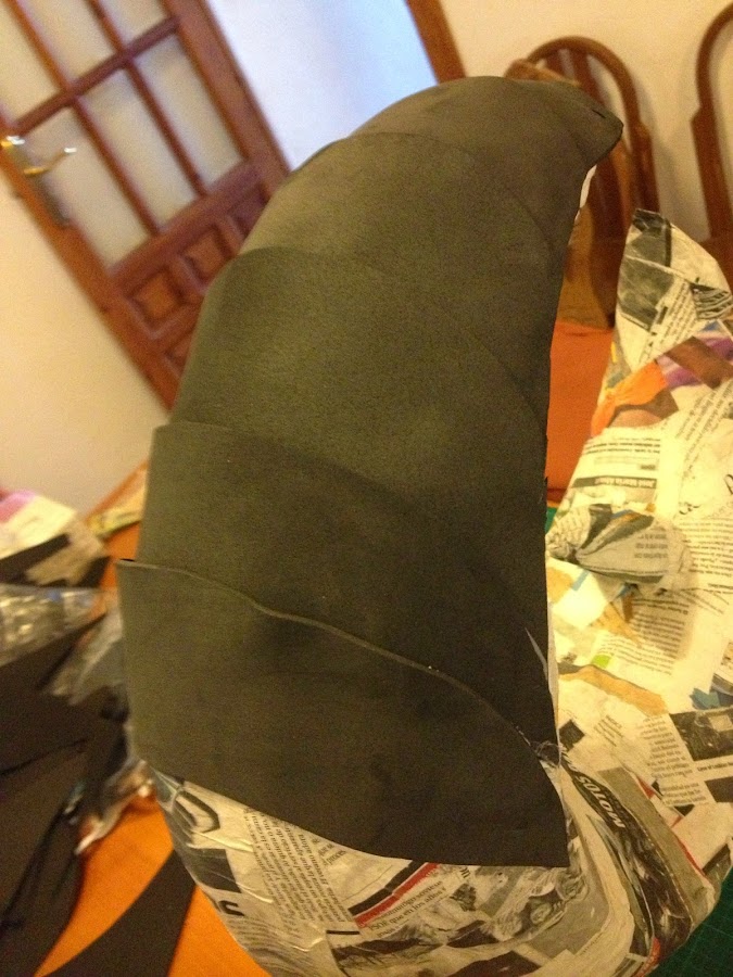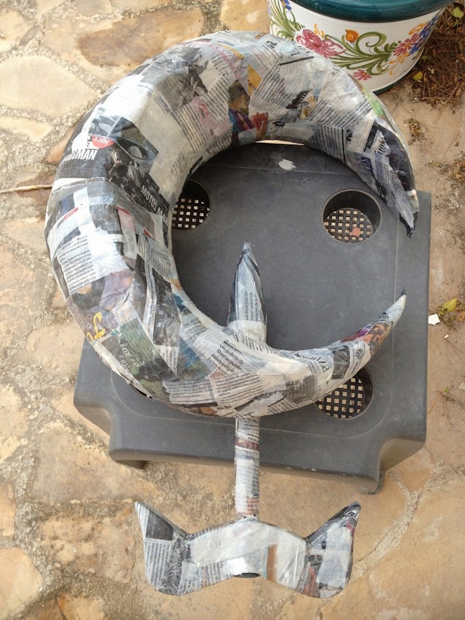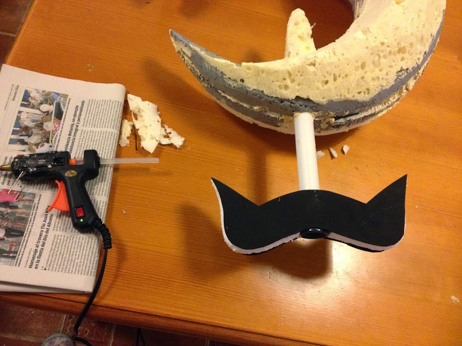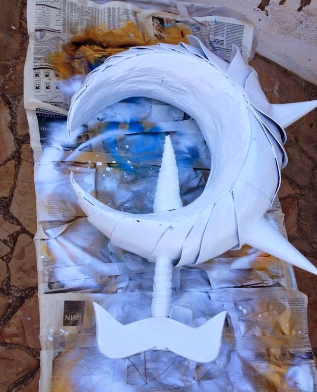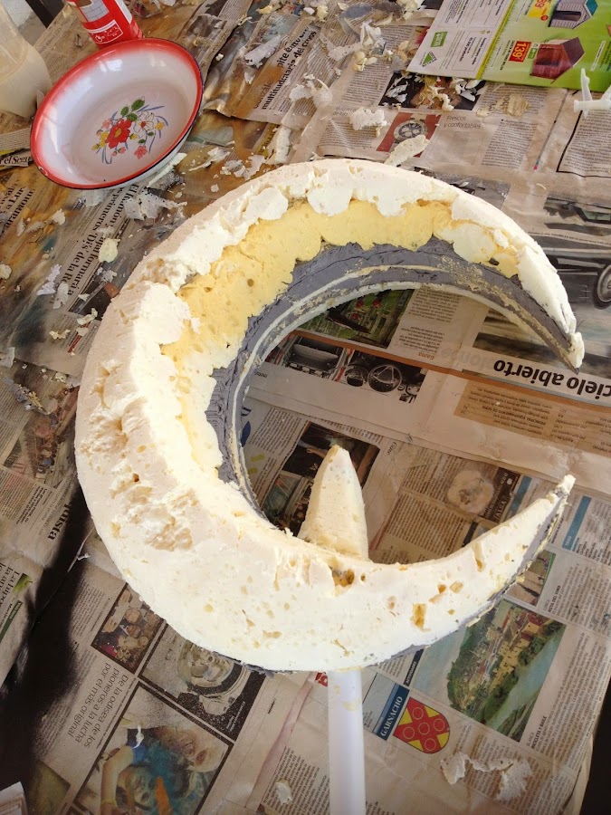 Respecto a los materiales, aislante, espuma de poliuretano, goma eva, geso (imprimación antes de pintar), pintura en spray, patina (pintura negra) aplicada con esponja para envejecer la plata, las gemas hechas con resina para barcos y colorante, siguiendo las intrucciones del frasco; pistola de pegamento caliente, papel maché (papel de periodico y engrudo)...