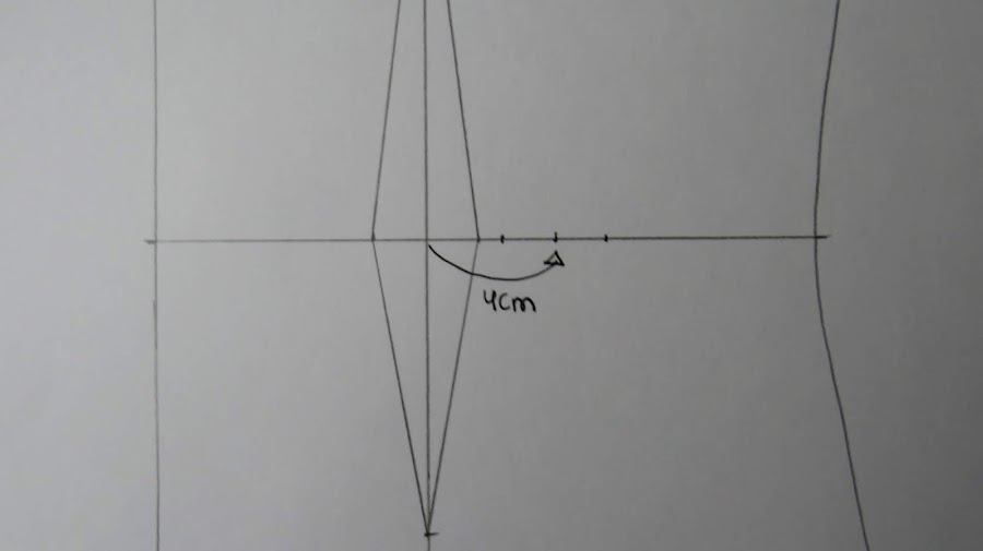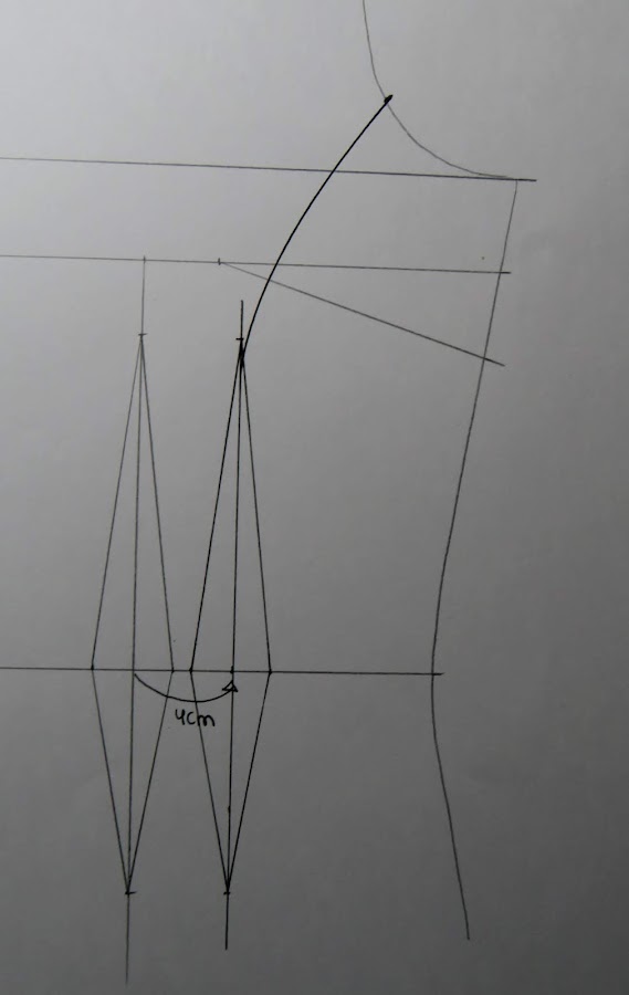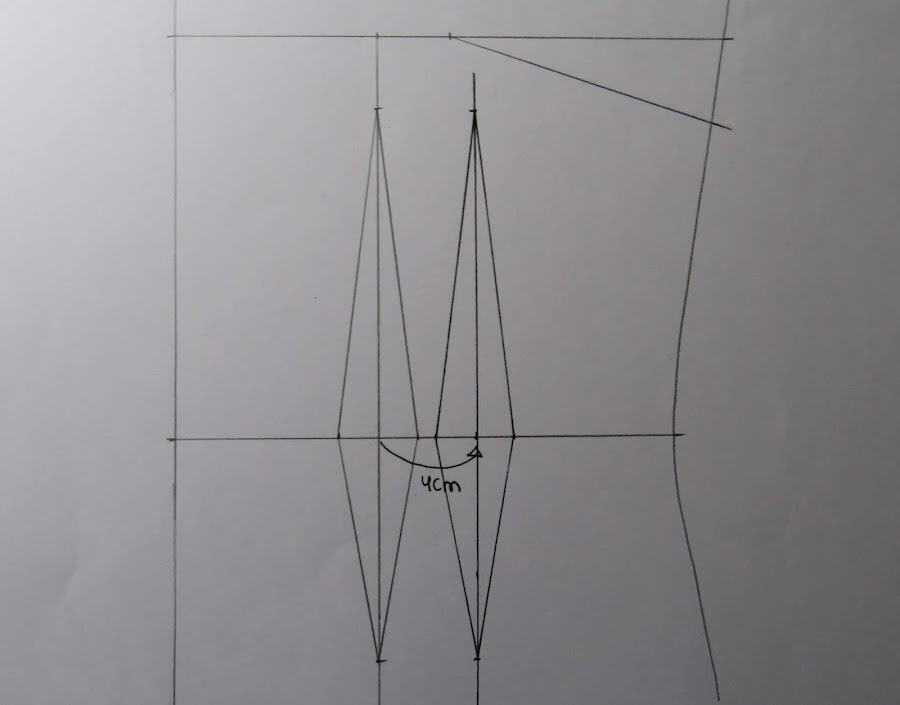 Partimos de nuestro patrón base, en este caso podemos hacer la pinza unos 3 cms. retirada del centro de pecho