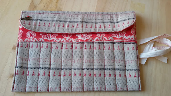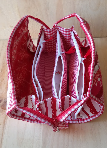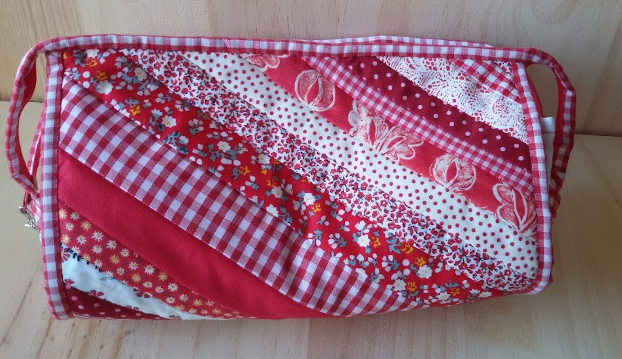 Así que decidí hacerle un neceser Sew Together Bag que tiene mucha cabida. Para el panel exterior utilicé trozos de telas en tonos rojos.