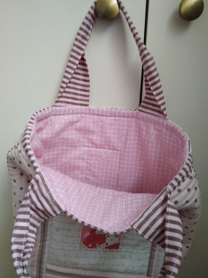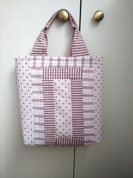 Para la bolsa utilicé unas telas en tonos rosas que tenía en casa combinando topos y rayas. El tamaño de las tiras no es algo premeditado, ya tenía las tiras cortadas de otros proyectos...