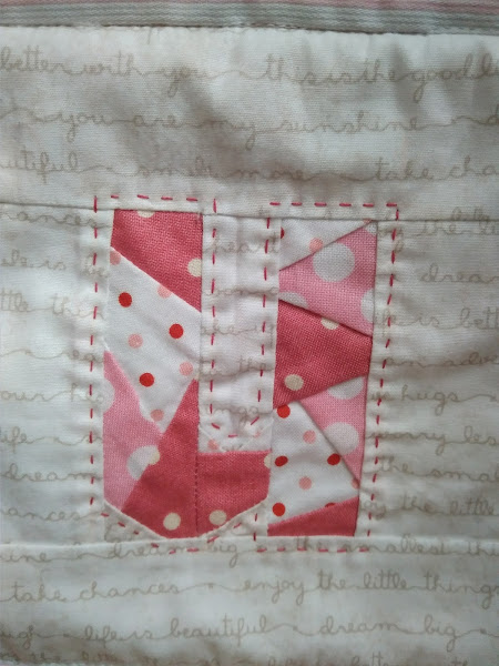 La letra está hecha con la técnica del paper piecing, con telas de topos en tonos rosas. Para el fondo utilicé una tela con texto en color beige.