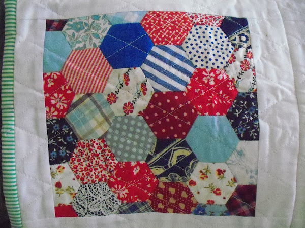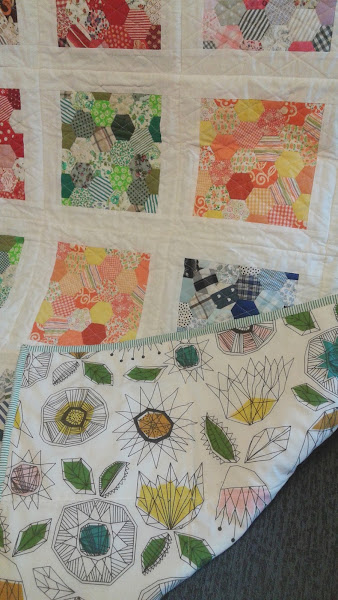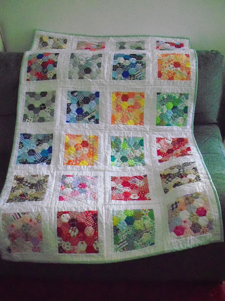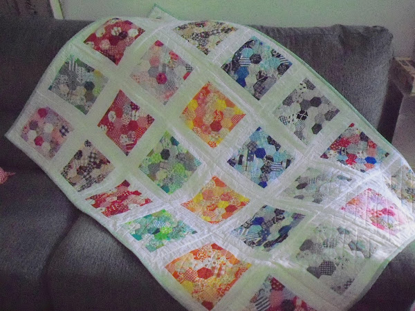 Desde entonces acabé los 24 bloques que necesitaba, los acolché todos por separado y ahí quedaron. Una mudanza a Vigo y recuerdo que en algún momento los uní todos y preparé el sandwich para acolchar. Pero nunca encontraba el momento, cada vez que ordenaba el cuarto de costura me lo encontraba y lo guardaba... Pero este año decidí que tenía que intentar acabar todos los grandes proyectos que tenía empezados y el primero, éste. Mi primera colcha con la técnica de EPP (English Paper Piecing). Y digo primera porque tengo otra en preparación ;)
