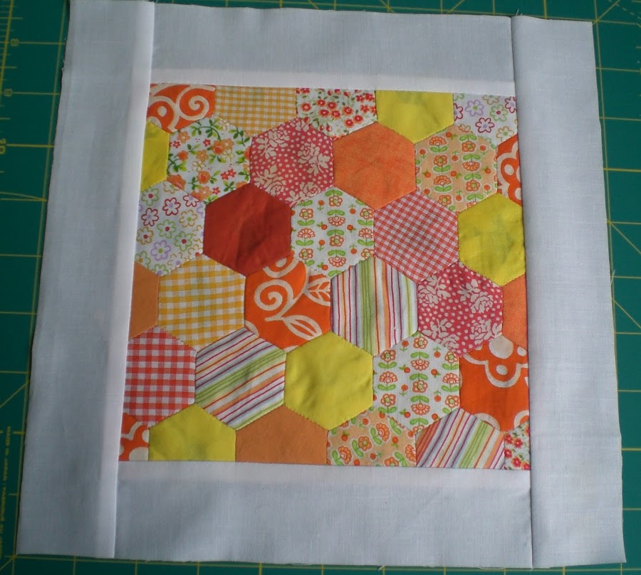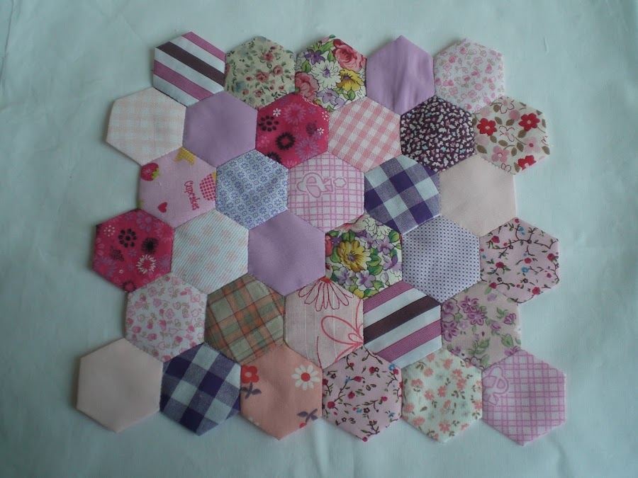 Cuando ya tuve una buena cantidad de hexágonos tuve que decidir de que medida haría cada bloque y que tela usaría para los bordes.