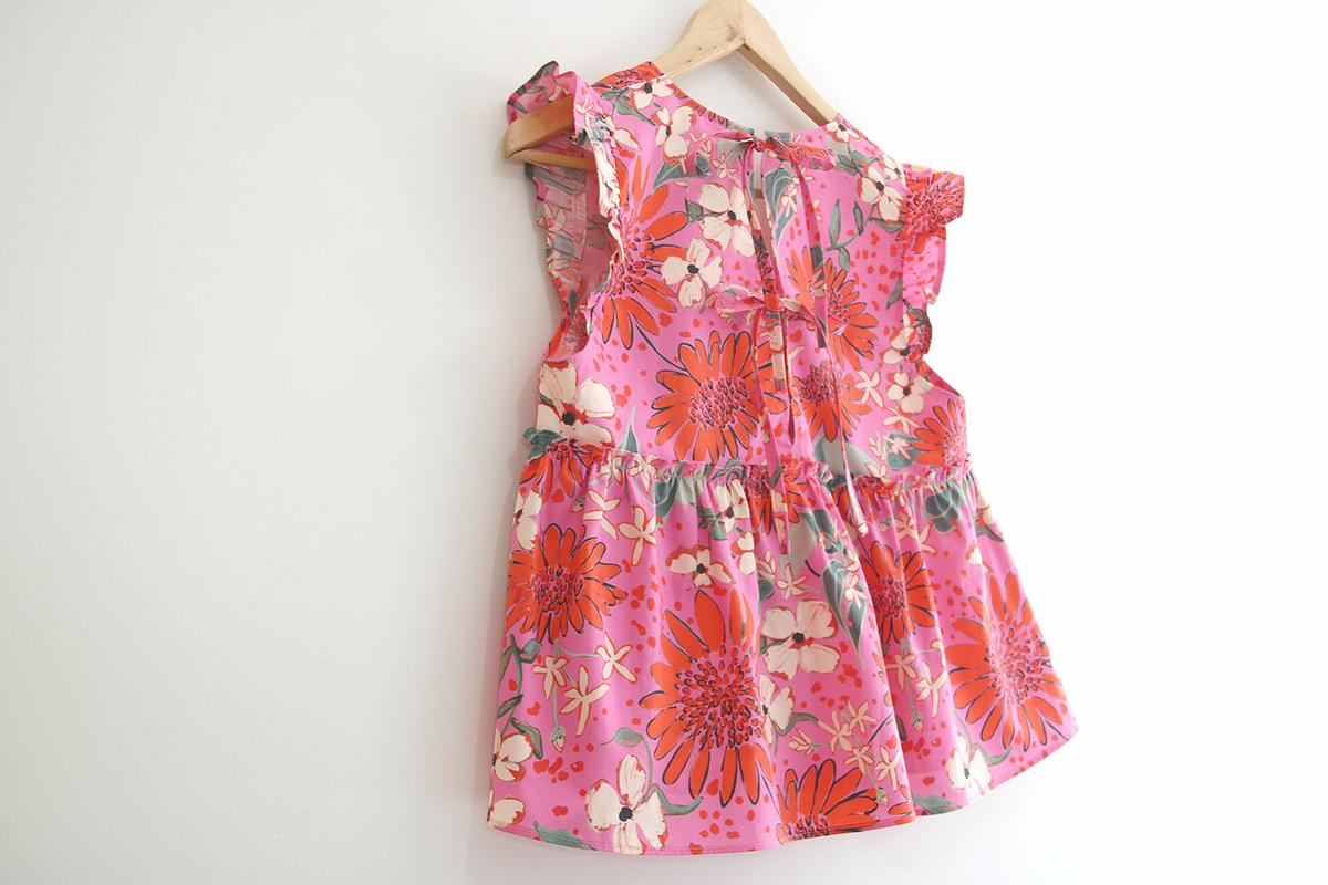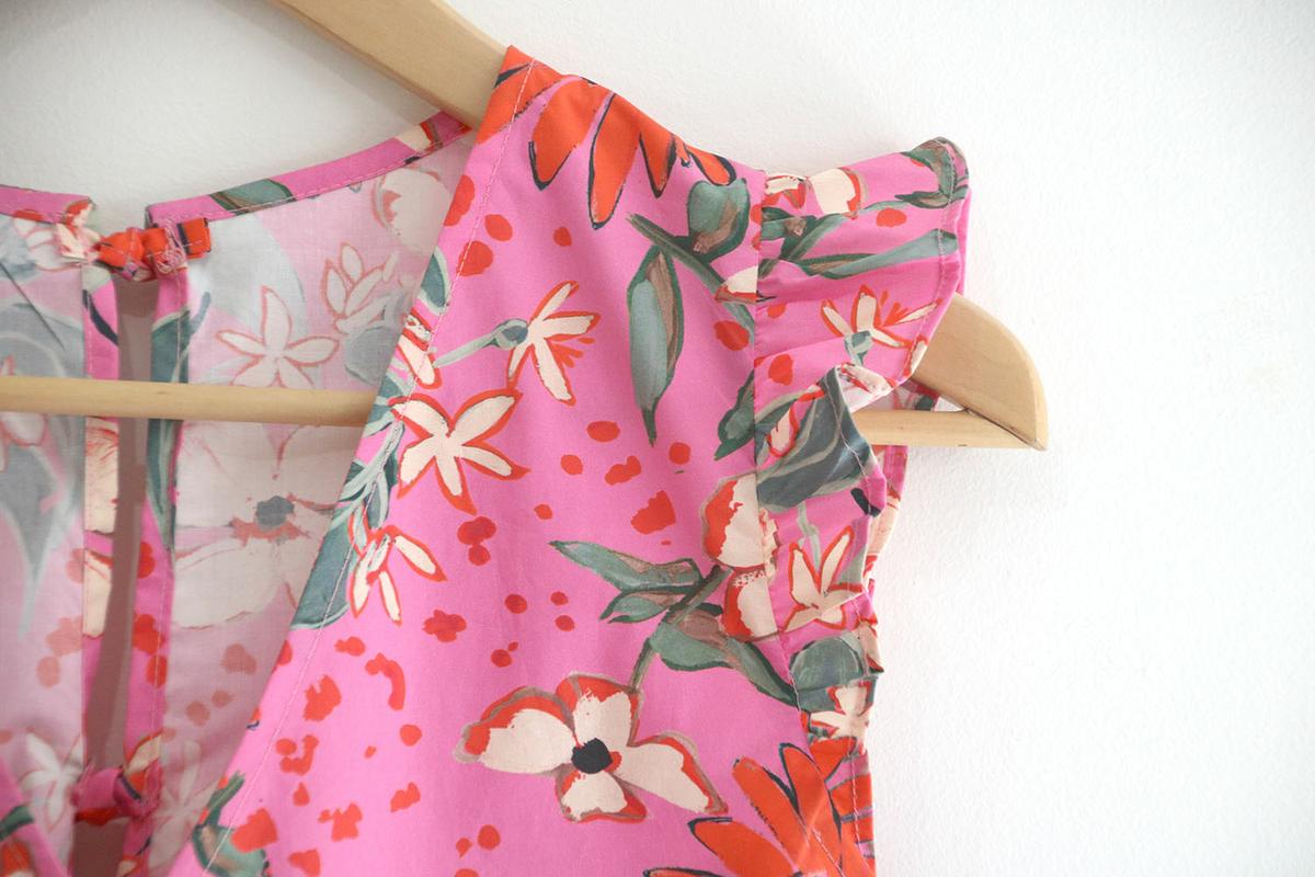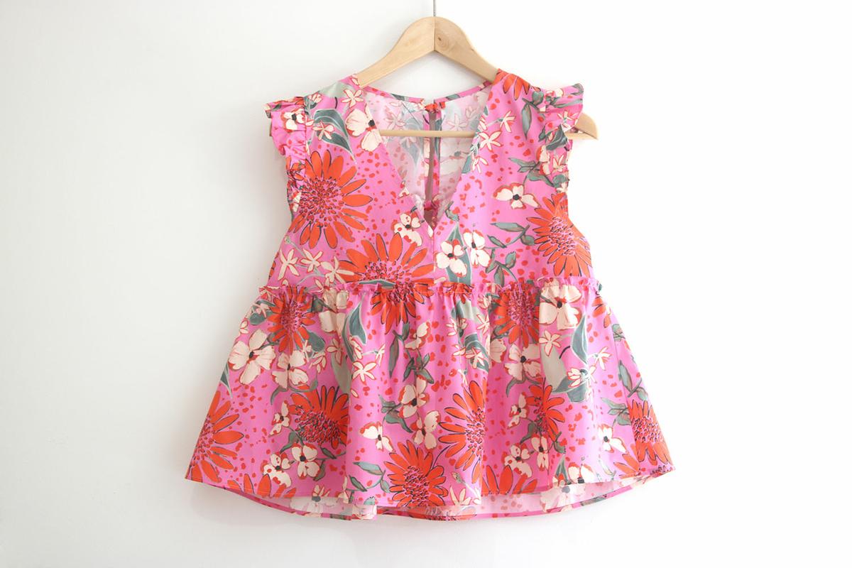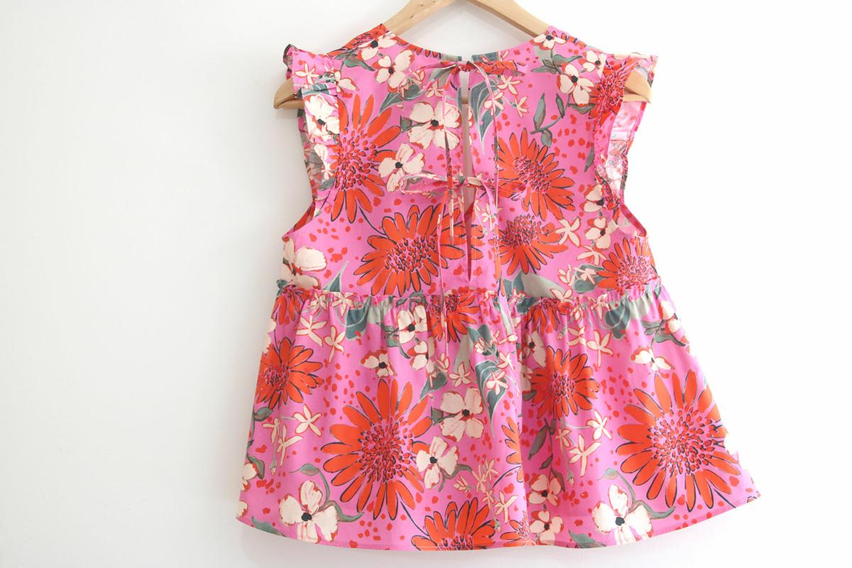 Seguro que cuando habéis visto la blusa habéis pensado: esta chica se ha vuelto loca, estamos en pleno otoño y esta mujer saca una blusa de los más primaveral, sin mangas con volantes y en rosa chicle con estampados…. Pues si, llámame loca, pero no voy a dejar atrás nada de lo que ya tengo hecho!!! Esta blusa la tenía planificada para sacar en agosto, pero mira como son las cosas de la vida, que uno planifica y las circunstancias mandan!!! Como mis circunstancias son las que son, y estoy feliz de poder no organizarme en absoluto por ver crecer a mis hijos (que conste que me agobia aveces lo de no poder planificar) es lo que hay y seguro que las seguidoras que están al otro lado del océano me agradecen mi falta de previsión, porque por allí si que está comenzando la primavera y verano.