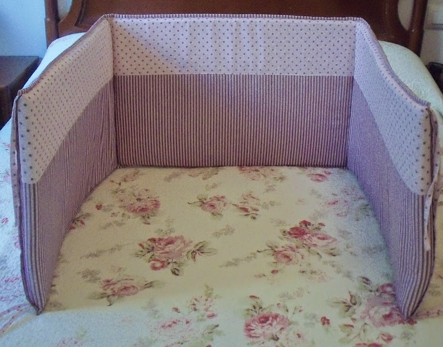 El encargo era un protector para cuna, un edredón y un cambiador. Ya había hecho anteriormente otro estilo de chichoneras, una entera con volantes, y una entera y otra pequeña para unos amigos.