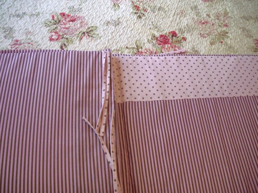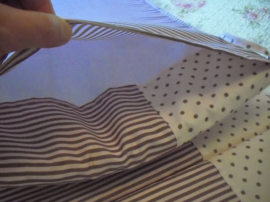 En el delantero combiné la tela de topos rosa y marrón con una tela de rayas en los mismos tonos. En cambio la trasera va toda en la tela de rayas.