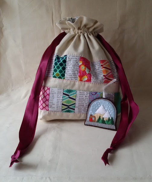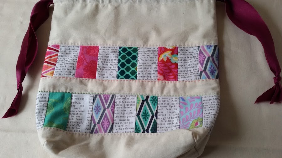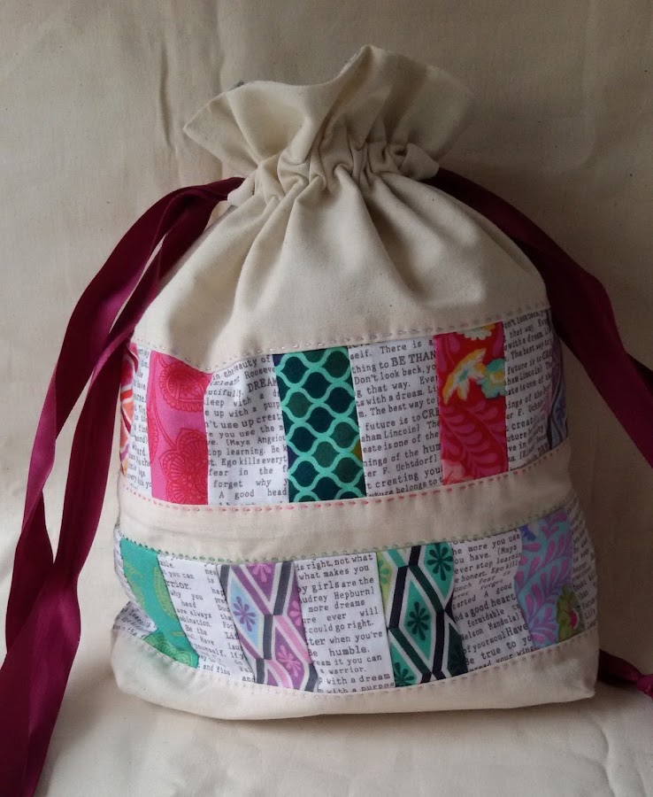 Una drawstring bag hecha combinando lino, telas de Tula Pink y una tela de texto que no recuerdo el nombre... me había tocado en un sorteo.