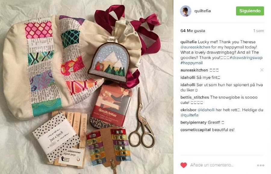 El otro día os hablaba de los regalos que había recibido en el intercambio de Instagram Drawstrig Bag Swap, y hoy toca que os enseñe los que envié yo. Me tocó enviarle a Anne Kari @quiltefia en Noruega.