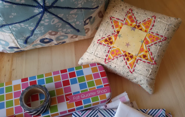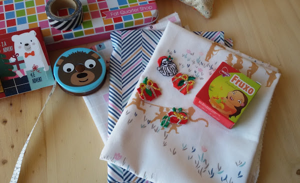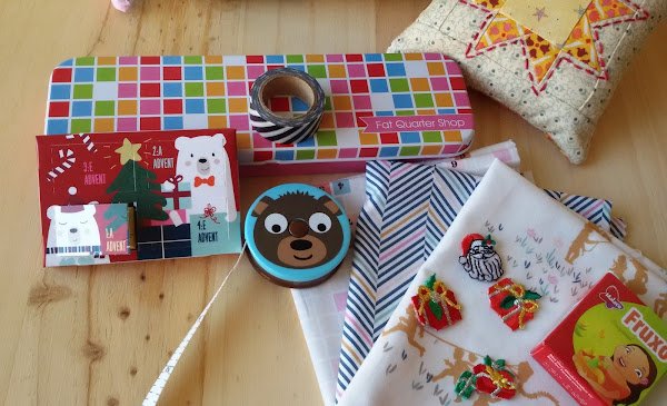 Y los extras fueron increíbles. Telas de Playground en tonos que no tenía, chocolate de Lindt, gominolas, unas etiquetas navideñas para usar de aplicación, una cinta métrica preciosa de un osito, una cinta de washi tape y una lata de Fat Quarter Shop... yo recuerdo tener una parecida para llevar los bolígrafos al instituto...