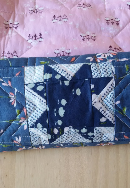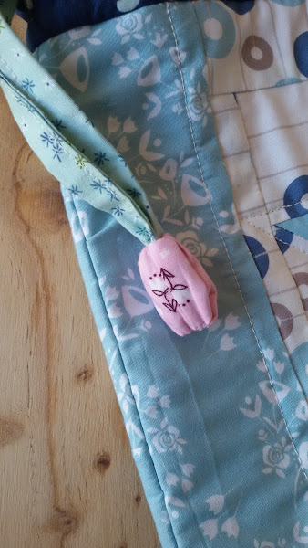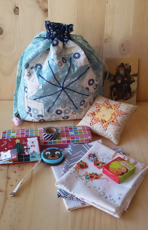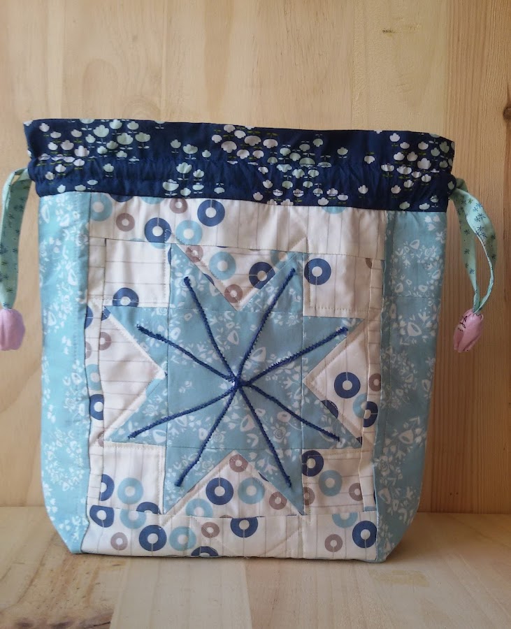 Me envió una drawstring bag hecha con estas telas con una estrella a cada lado, y una estrella oculta en el fondo del forro. Y una preciosa terminación de las cintas simulando tulipanes.
