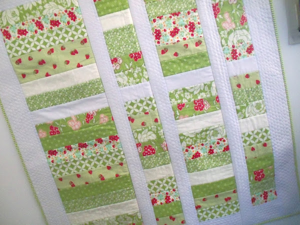 It is made with the QAYG technique and fabrics for the Hello Darling collection by Bonnie & Camille. Using this technique allows me to quilt using my home machine.