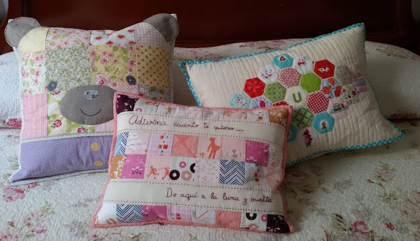 Pronto pasaremos a Uxía a su cuna, y allí tendrá sus cojines. Falta alguno que aún no os puedo enseñar, y seguro que se me ocurre algún otro para coser. Sólo espero que no salga al padre en su odio hacia los cojines ;)